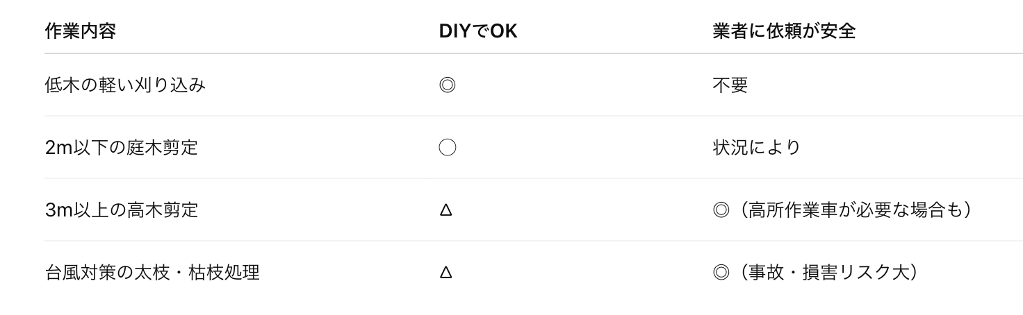 👉 豊田市では3m以上の樹木は「高所作業」扱いになるため、業者依頼が推奨されます。