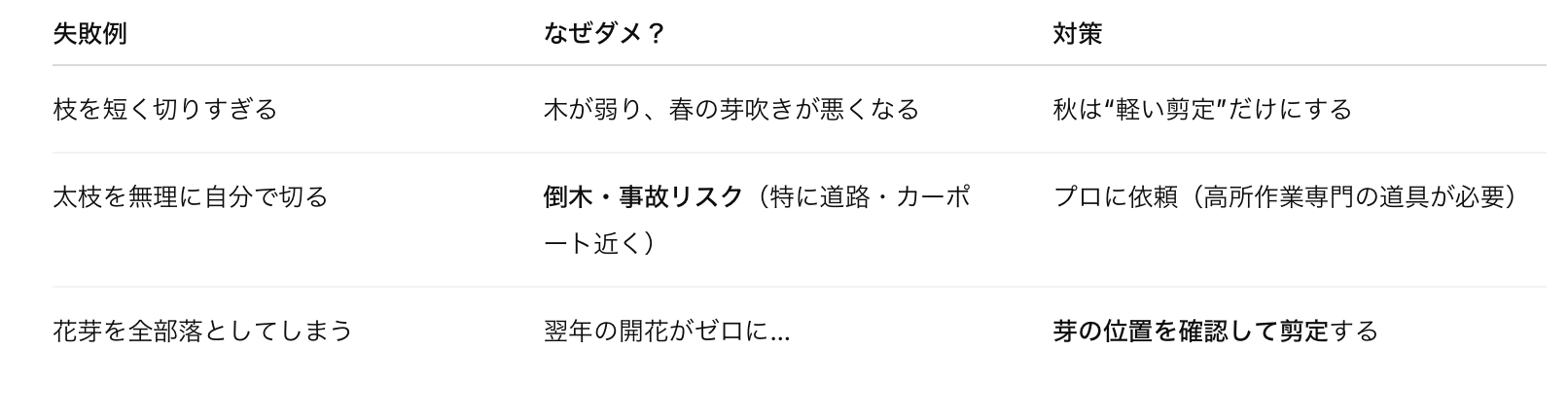 ❌ 強い切り戻しや大掛かりな伐採は冬〜春の適期に回す