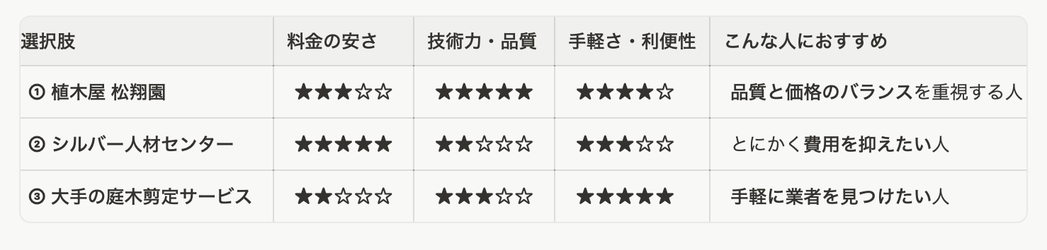 •「品質も価格も妥協したくない。安心して任せたい」 → ① 植木屋 松翔園