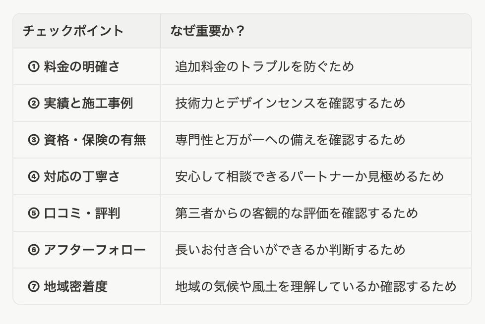 後悔しない業者選びのために、以下の7つのポイントを必ずチェックしましょう。