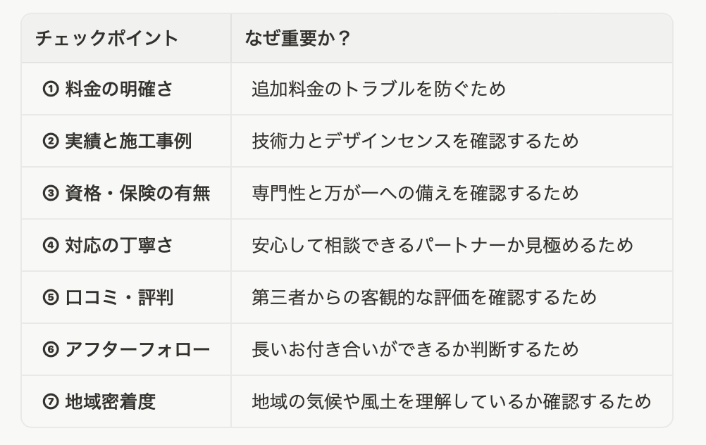 後悔しない業者選びのために、以下の7つのポイントを必ずチェックしましょう。