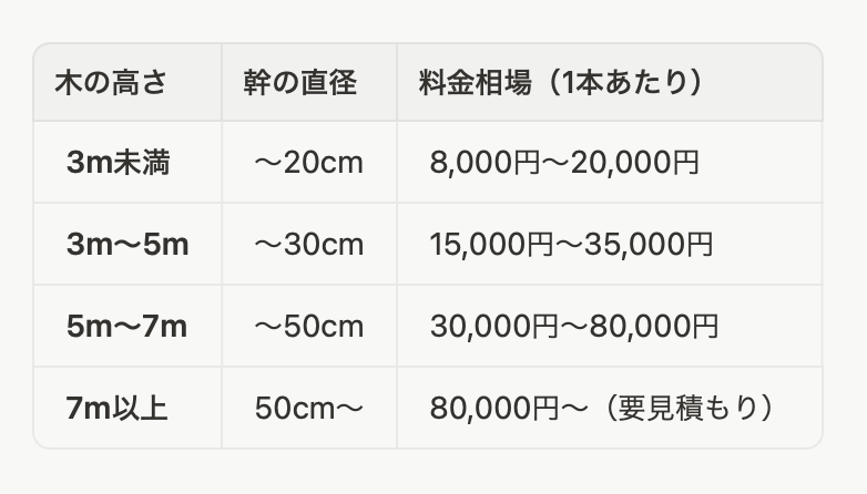 伐採の料金は、剪定よりも複雑で、木の高さと幹の太さ、そして作業の危険度によって大きく変動します。以下は、基本的な料金相場です。