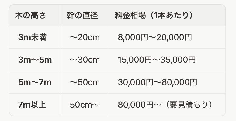 伐採の料金は、剪定よりも複雑で、木の高さと幹の太さ、そして作業の危険度によって大きく変動します。以下は、基本的な料金相場です。