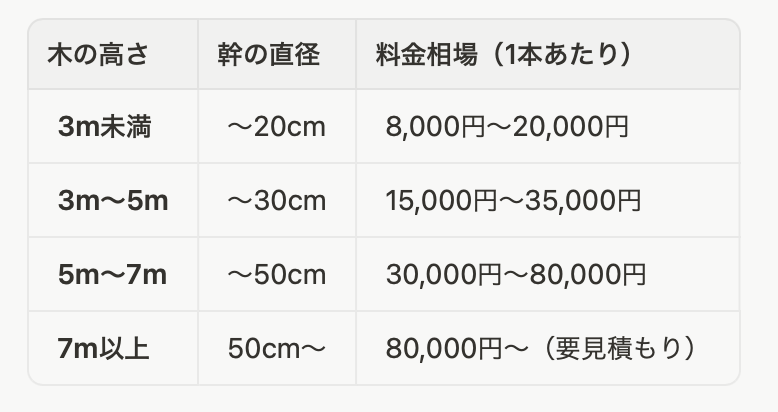 伐採の料金は、剪定よりも複雑で、木の高さと幹の太さ、そして作業の危険度によって大きく変動します。以下は、基本的な料金相場です。