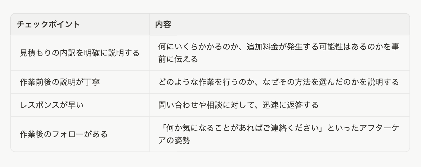 作業の技術が高くても、コミュニケーションが不十分だと満足度は下がります。口コミで高評価の業者は、以下のような対応を徹底しています。