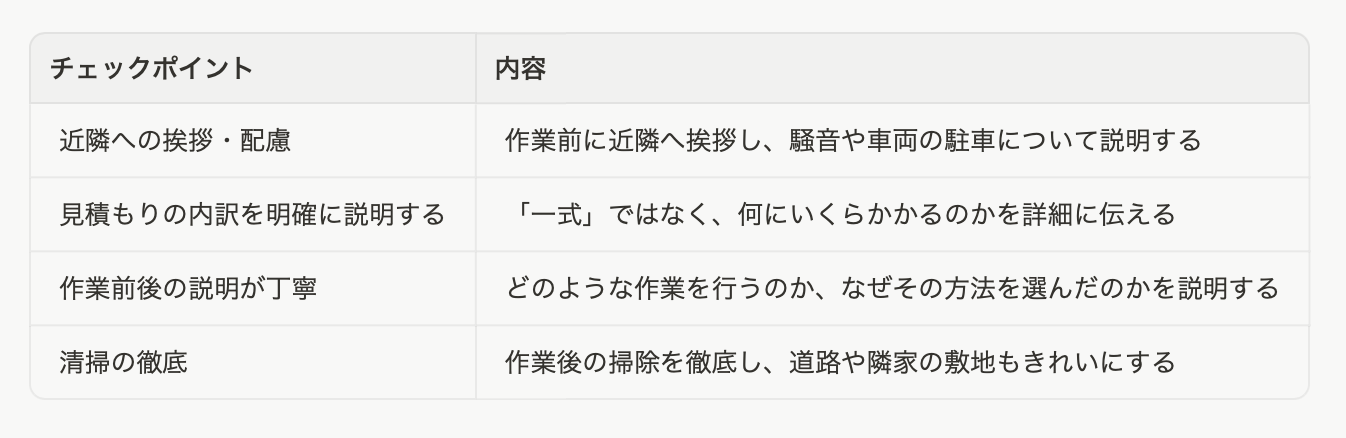 作業の技術が高くても、コミュニケーションが不十分だと満足度は下がります。特に名古屋市のような住宅密集地では、近隣への配慮が不可欠です。口コミで高評価の業者は、以下のような対応を徹底しています。