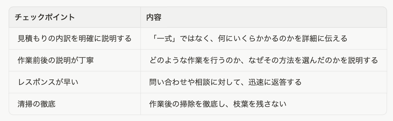 口コミで高評価を得ている植木屋には、共通する特徴があります。単に「星5つ」というだけでなく、以下の3つの基準を満たしているかどうかが重要です。
