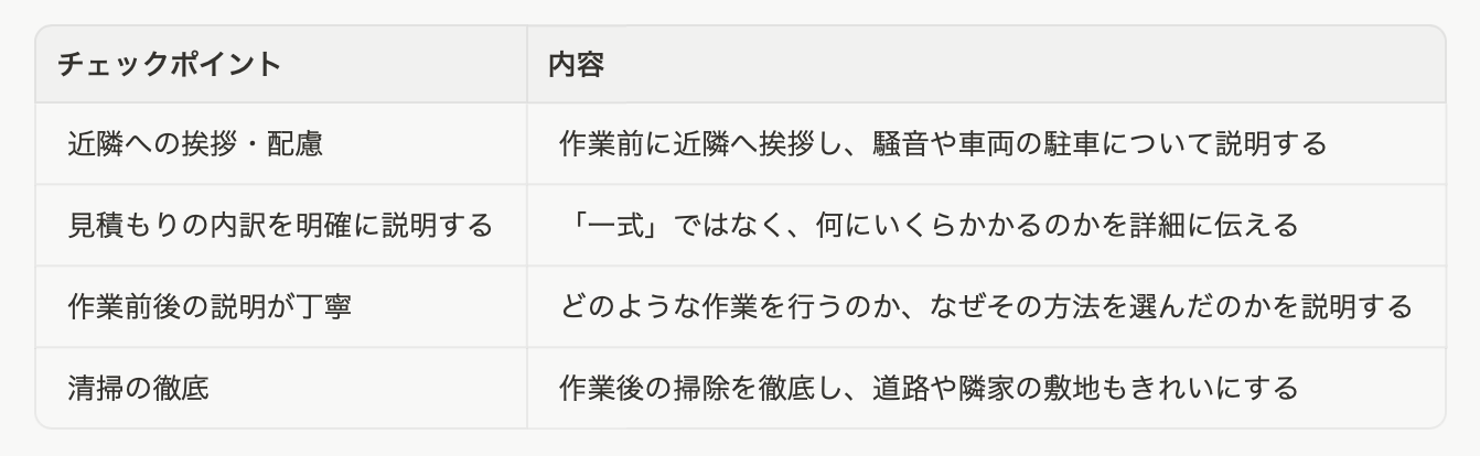 作業の技術が高くても、コミュニケーションが不十分だと満足度は下がります。特に住宅密集地では、近隣への配慮が不可欠です。口コミで高評価の業者は、以下のような対応を徹底しています。