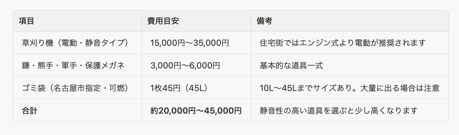 自分で草刈りをする場合、主な費用は道具代とゴミ袋代です。