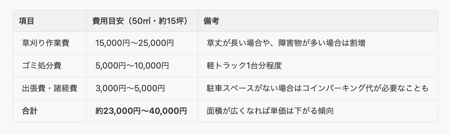 業者に依頼する場合の費用は、草刈りの面積や草の丈、処分費によって決まります。