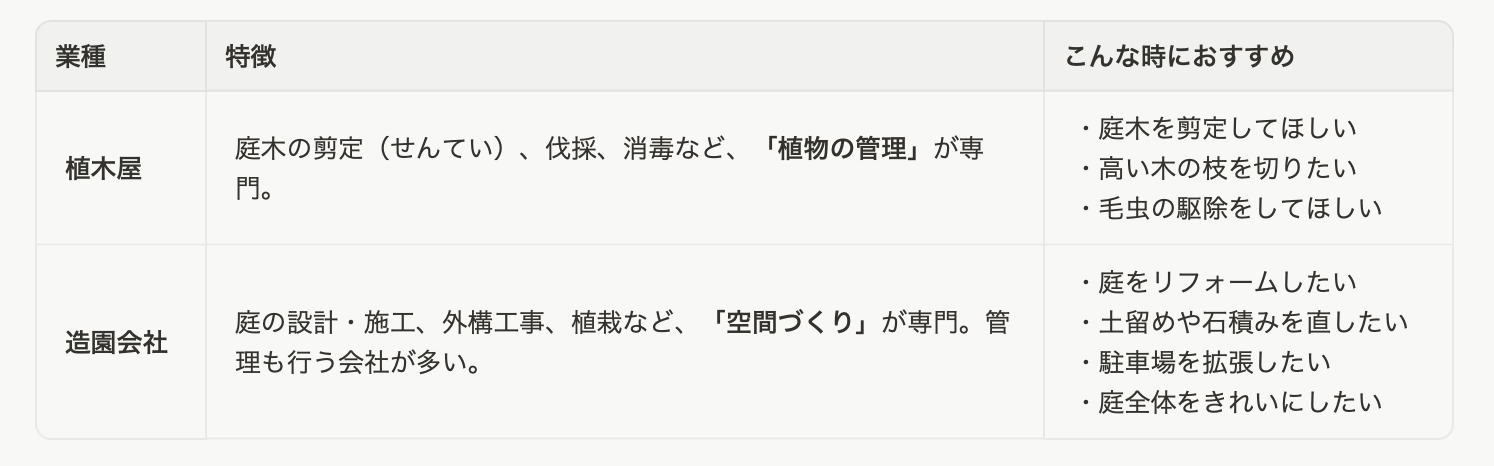 まずは、依頼先を絞り込むために「植木屋」と「造園会社」の違いを整理しましょう。