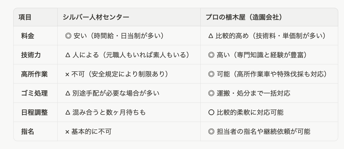 ひと目でわかる!シルバー人材センター vs 植木屋 比較表