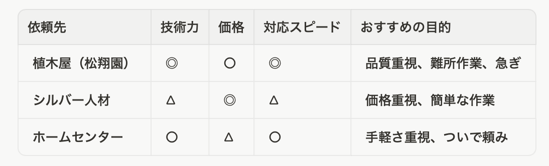 「大切な松の木を剪定してほしい」なら植木屋一択ですし、「裏庭の雑草だけ抜いてほしい」ならシルバー人材センターがコスパ最強です。
