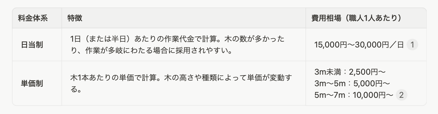 日当制の場合、作業に何日かかるかで見積もり総額が大きく変動します。事前に作業完了までの日数を確認することが重要です。単価制の場合も、木の高さの計測方法が業者によって異なる場合があるため、どこを基準に高さを測るのか確認しておくと安心です。