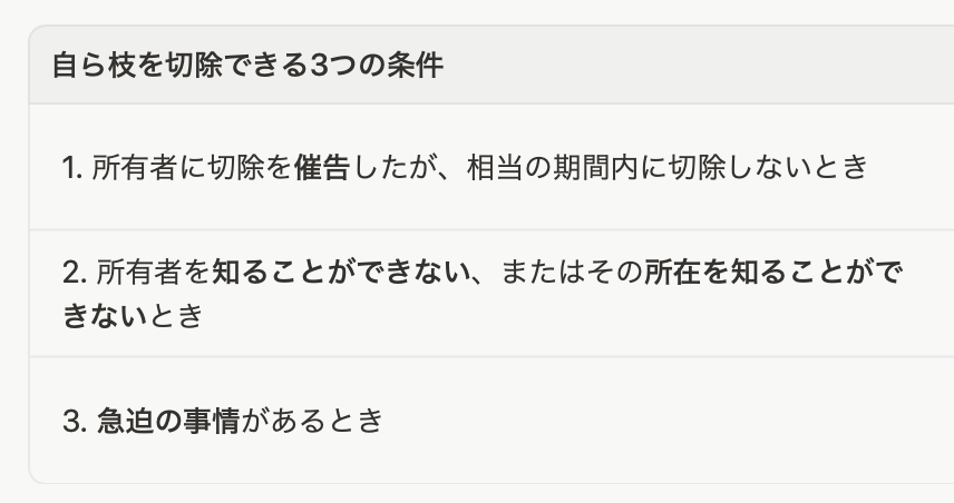 しかし、2023年4月1日に施行された改正民法第233条により、このルールが大きく変わりました。原則として所有者に切ってもらう点は変わりませんが、以下の3つのケースでは、土地の所有者が自ら枝を切り取ることが可能になったのです。