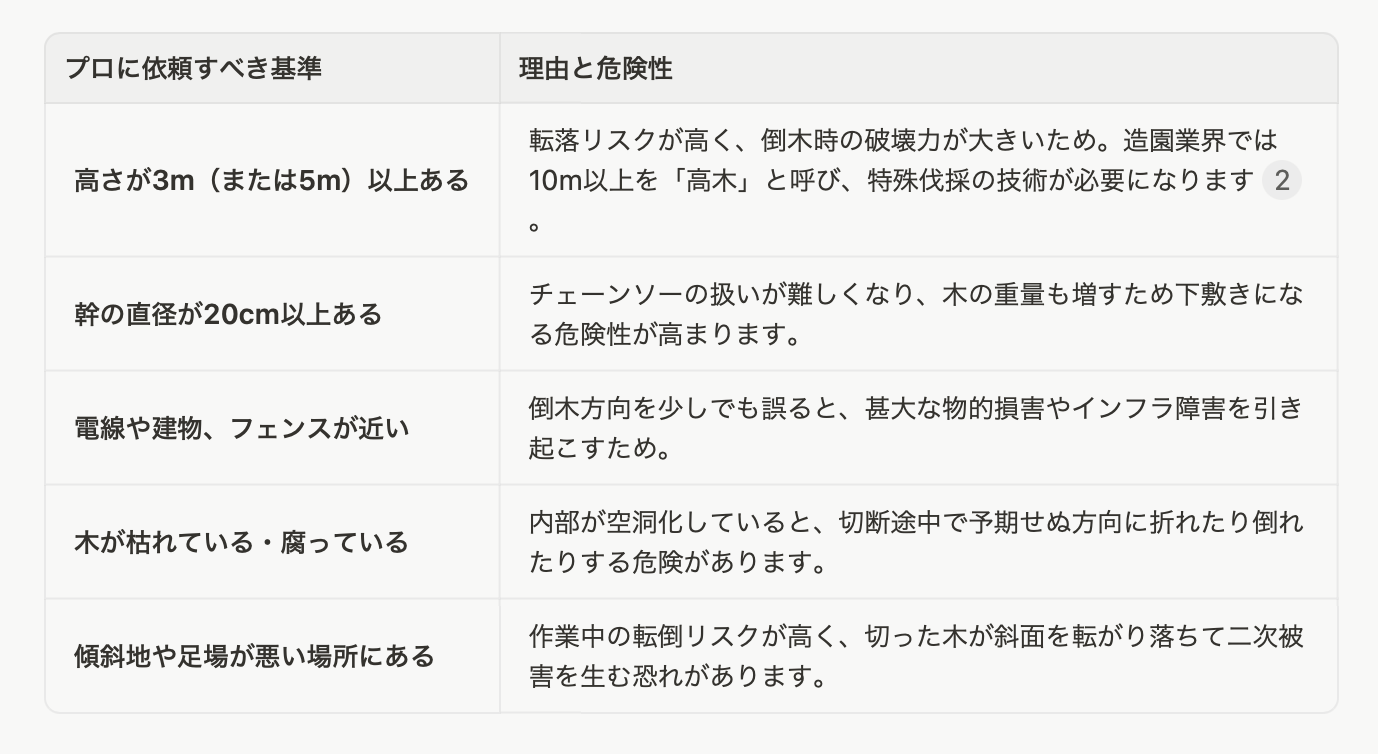 以下の条件に一つでも当てはまる場合は、迷わずプロの伐採業者に依頼してください。
