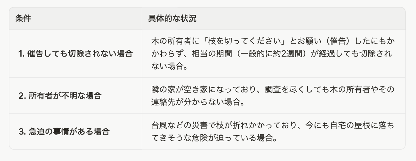 これまでの民法(第233条)では、「隣の木の根が越境した場合は自分で切ってもよいが、枝が越境した場合は所有者に切らせなければならない」と定められていました。しかし、2023年4月1日に施行された改正民法により、以下の3つの条件のいずれかに当てはまる場合、越境された側の住人が自分で枝を切り取ることができるようになりました 。